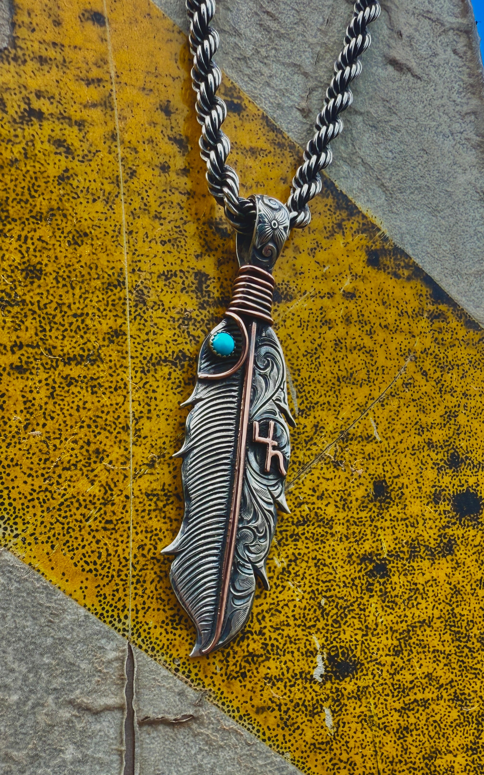 The Southern Feather is highlighted with Copper Accents, American Mined Turquoise and A Weathered Antique Finish. Each one is individually made and hand engraved. This pendant can be paired with any chain up to 7mm in thickness. Click the drop down for more purchasing options.