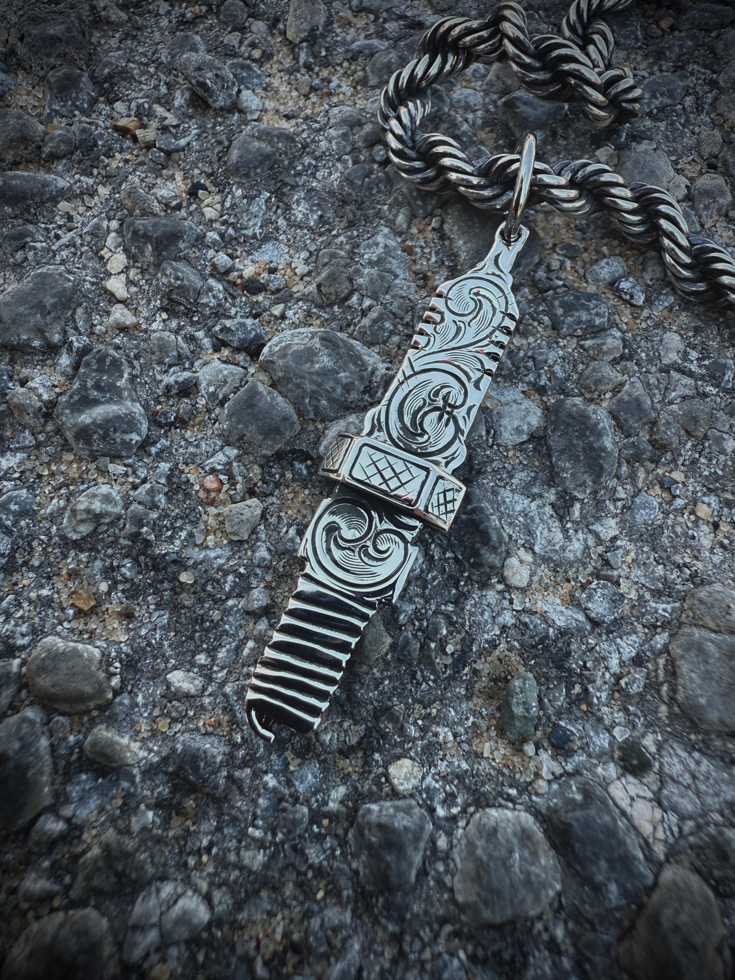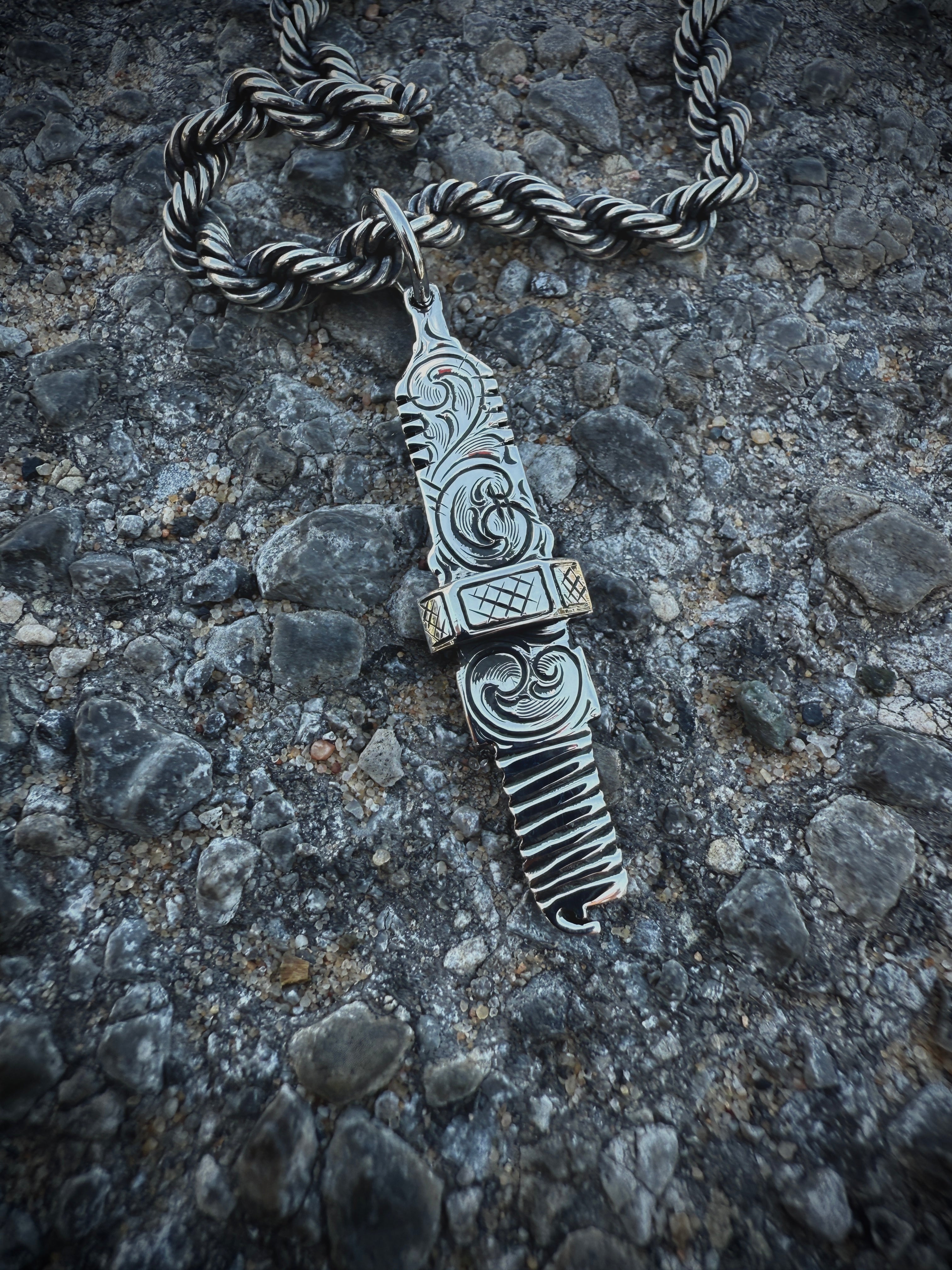 Custom Spark Plug Design made to order. I make this in 1.75" in length and has all those minor details necessary. Shown ere with our 5mm Weathered Rope Chain. This one will work with all our chains up to 6mm.