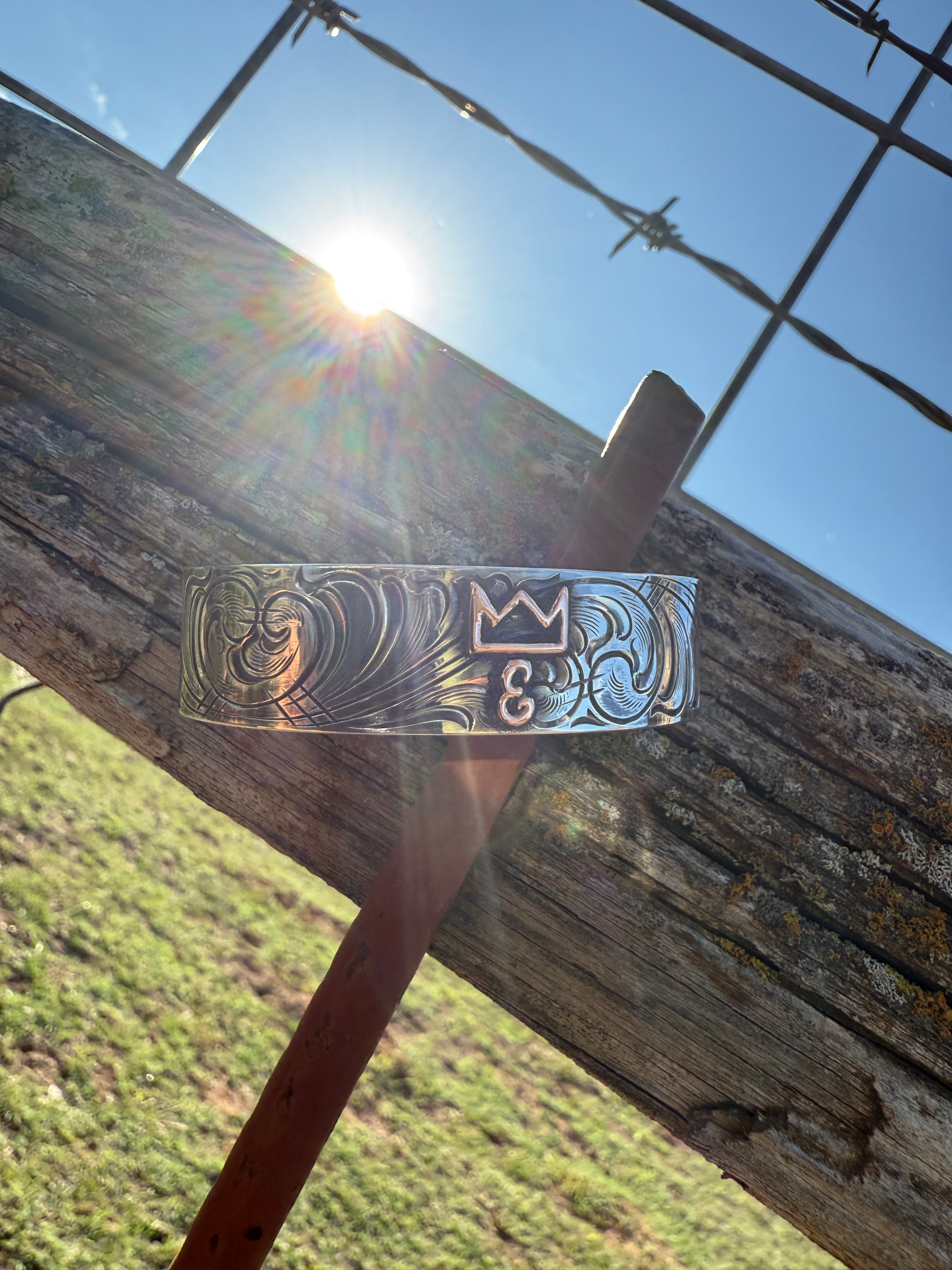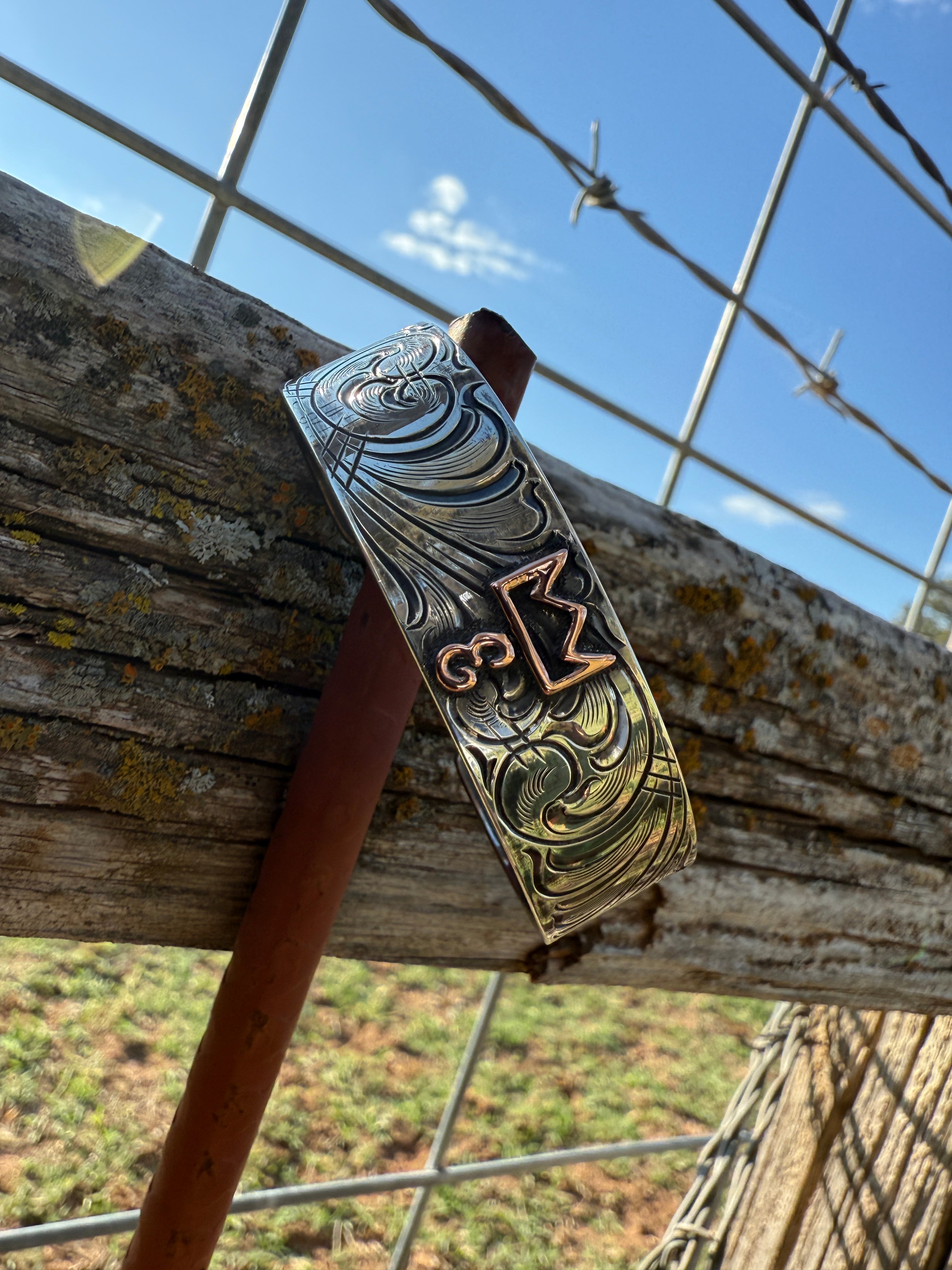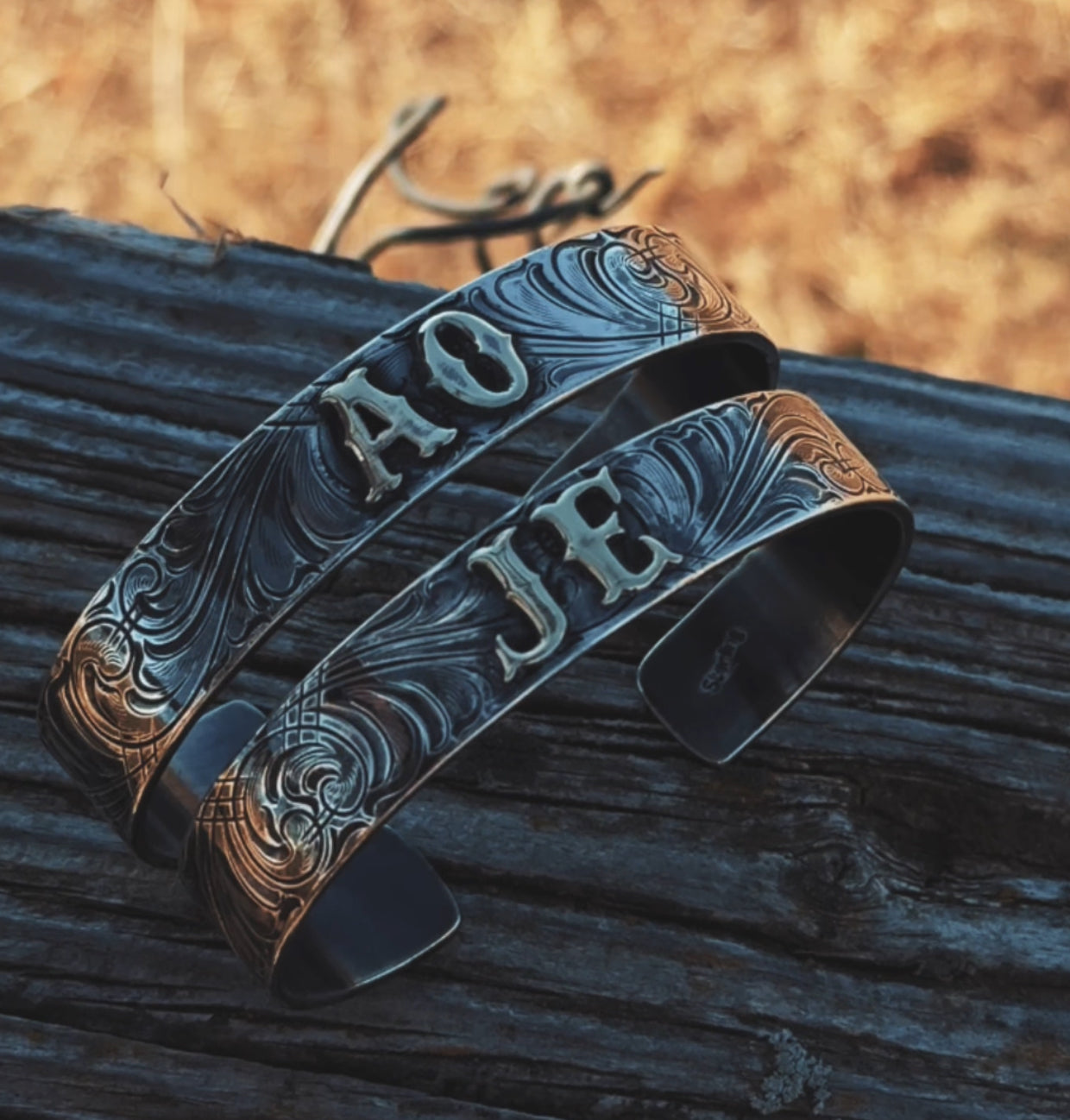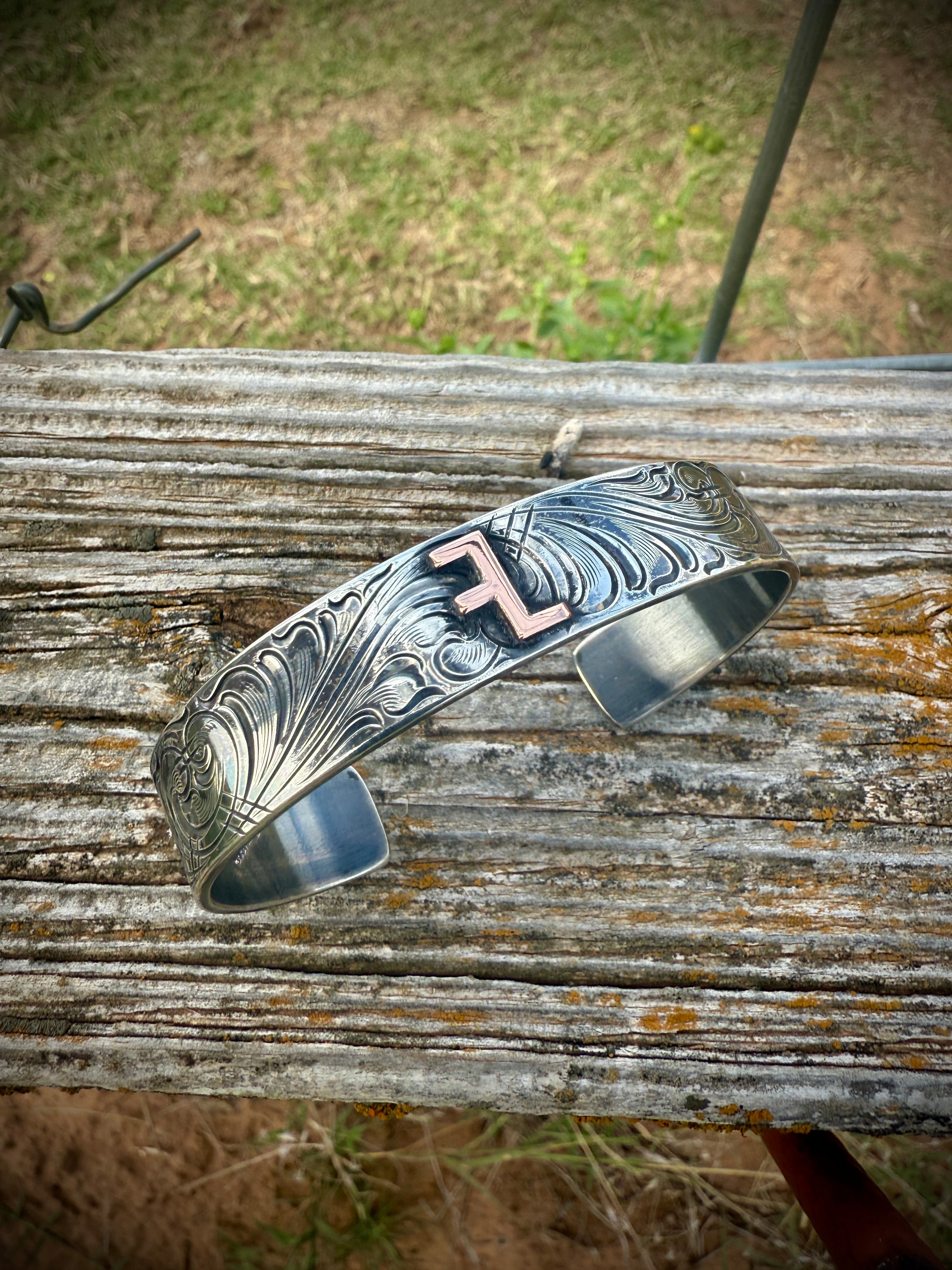The Panhandle Bracelet is 5/8'' in width and made with a sturdy 14 gauge solid sterling silver. It is fully engraved in the western bright cut style that we have come to be known for. You can add your brand or up to three initials in copper, silver or brass. We can put the brand in the center or on the end. This is available in any men's or women's sizing.