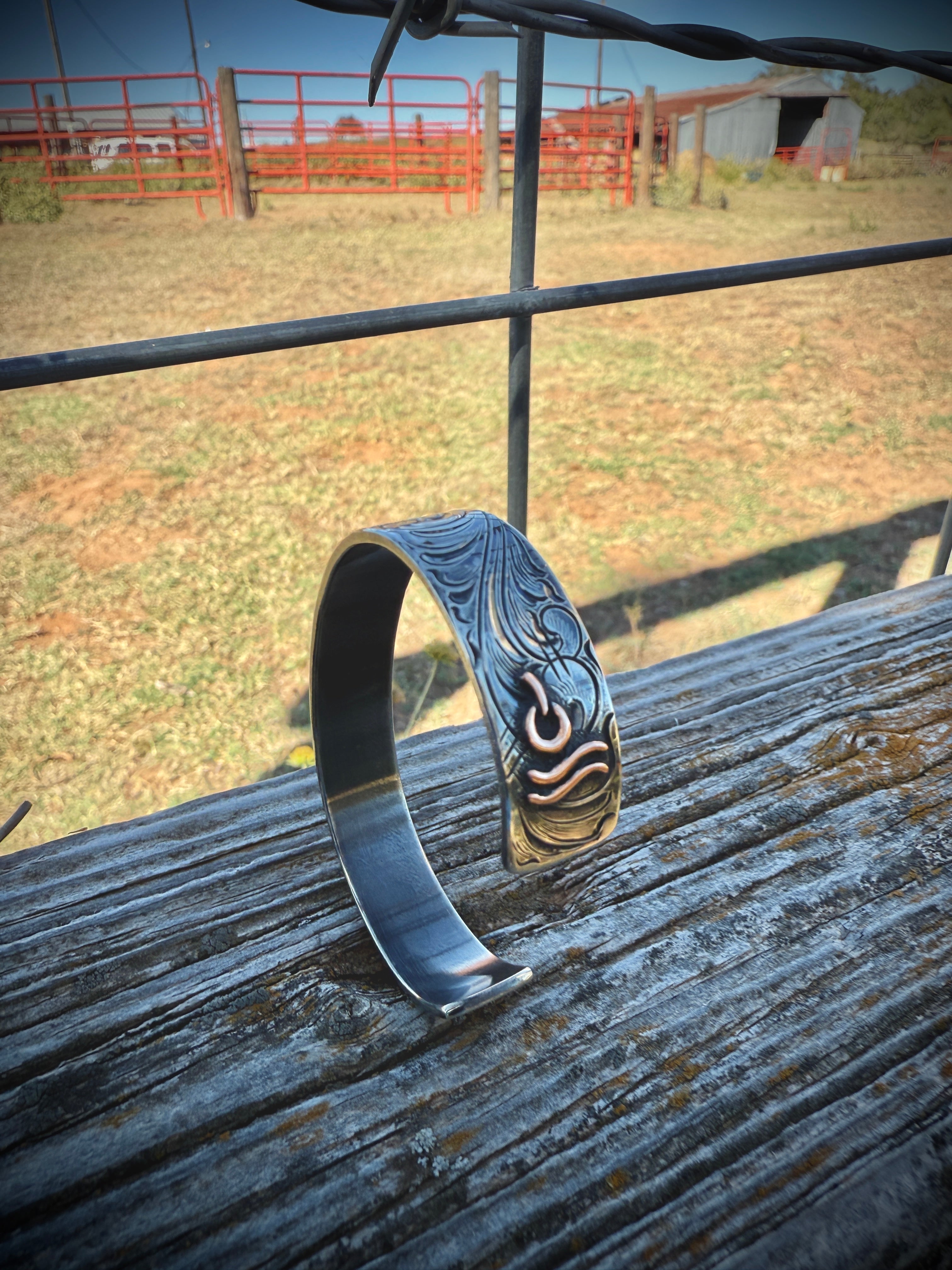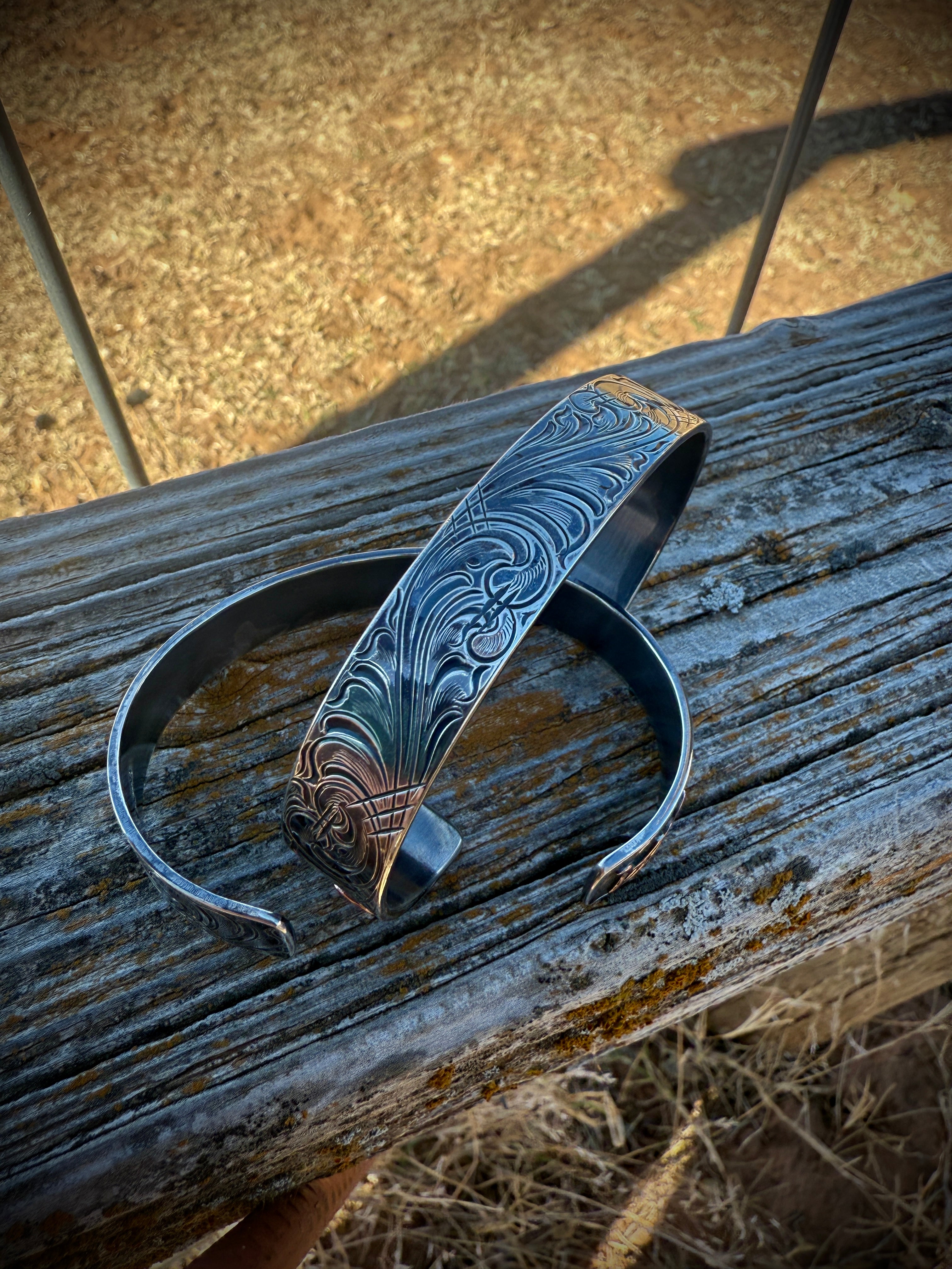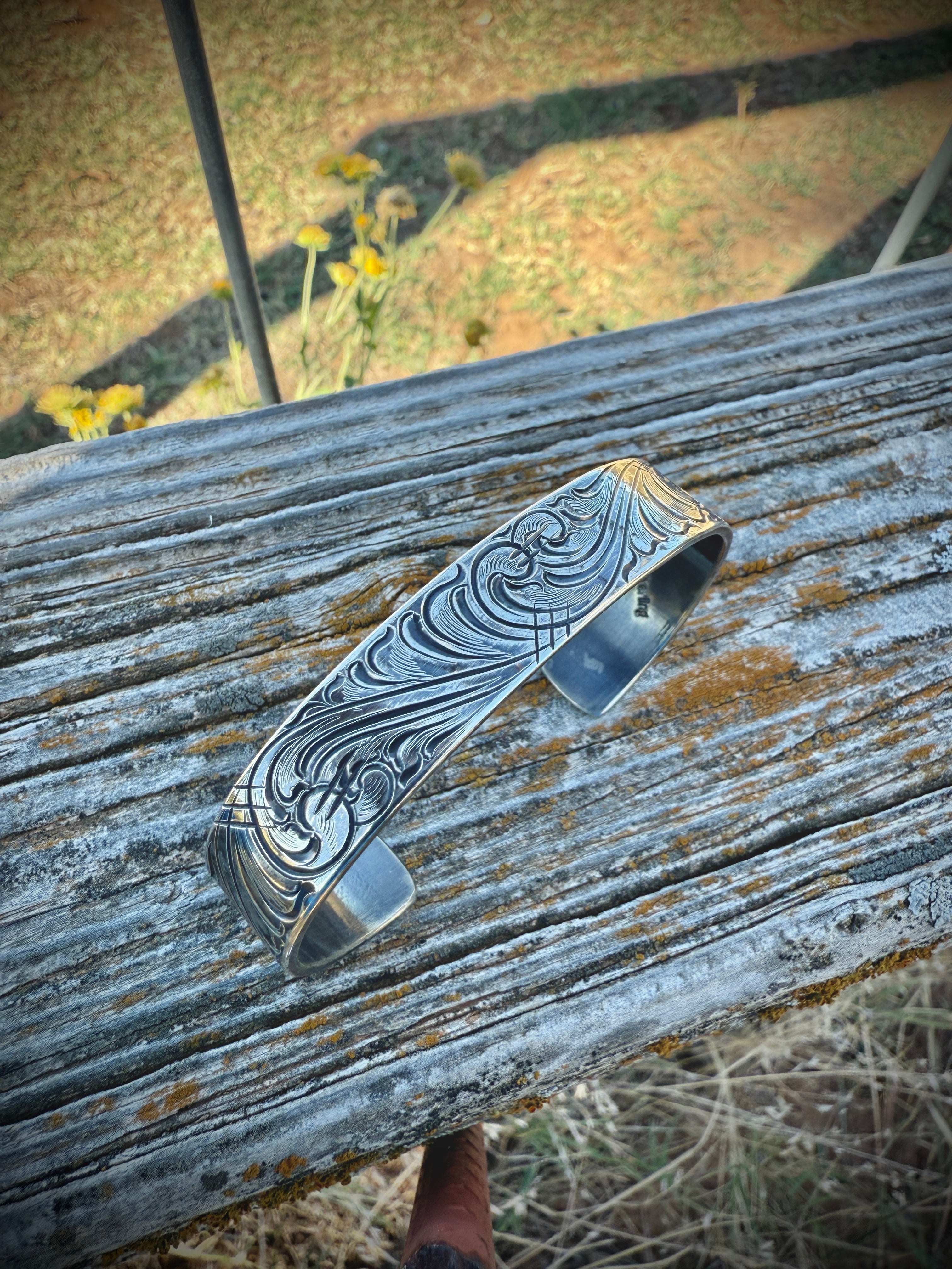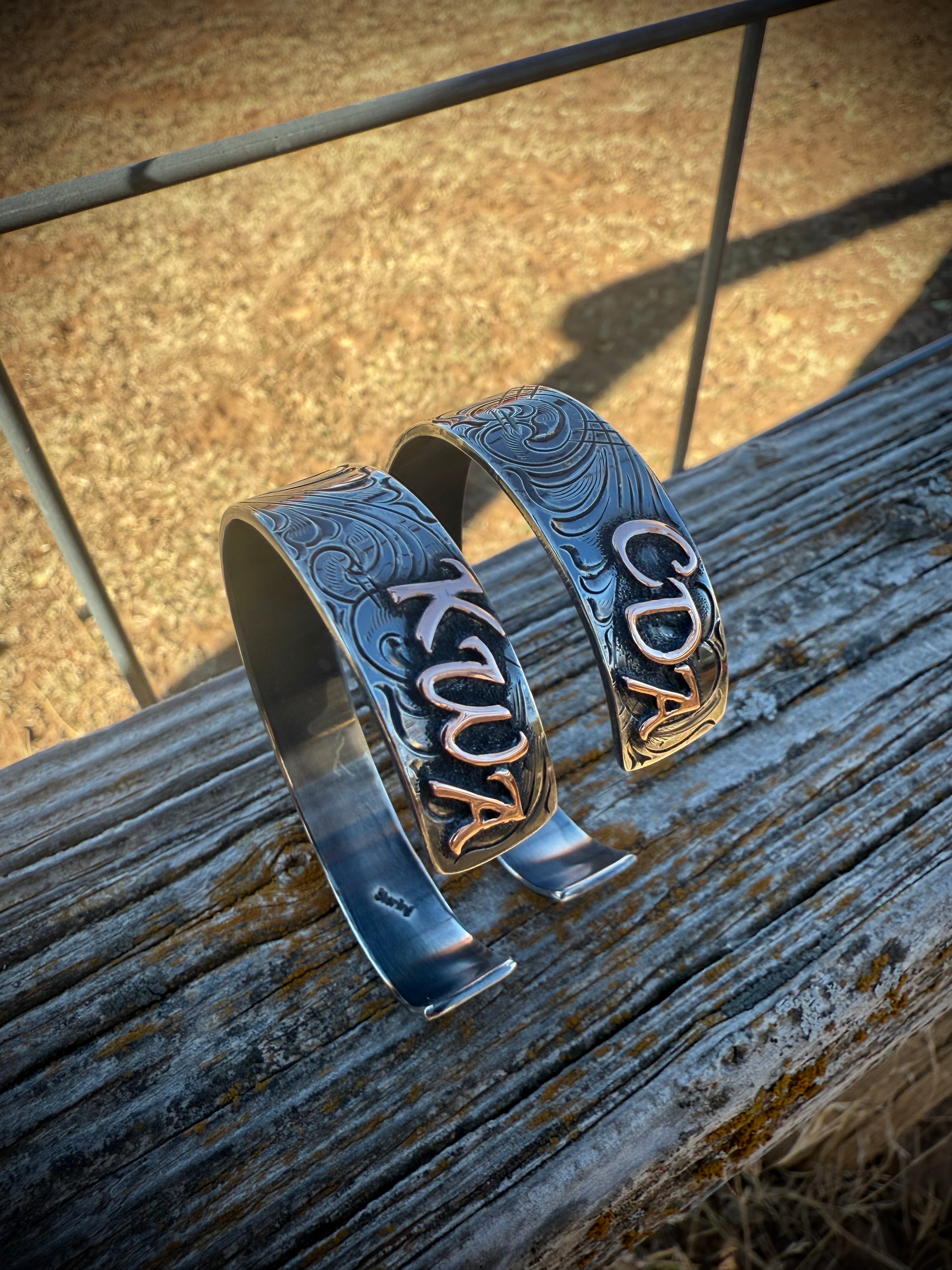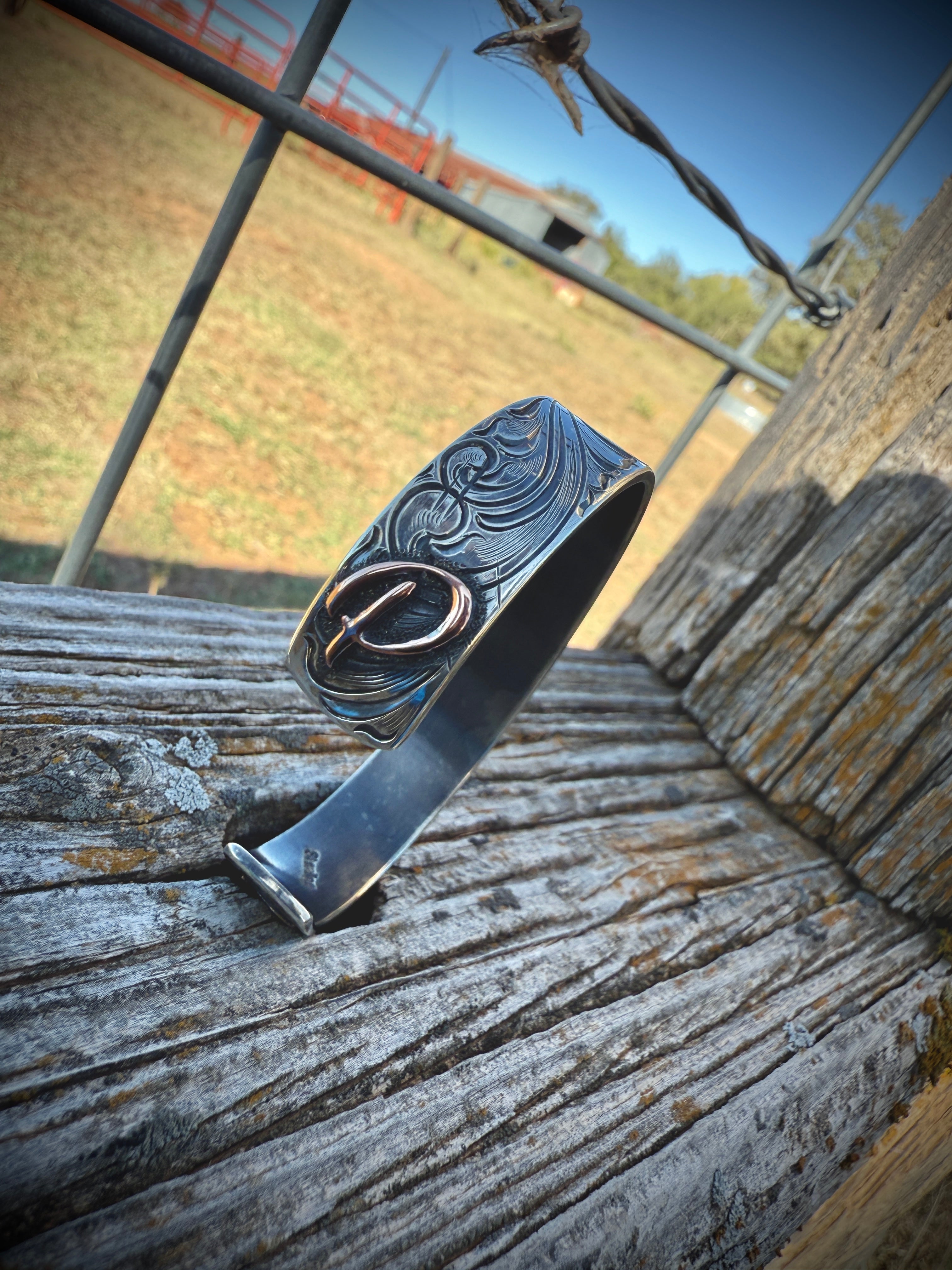 The Panhandle Bracelet is 5/8'' in width and made with a sturdy 14 gauge solid sterling silver. It is fully engraved in the western bright cut style that we have come to be known for. You can add your brand or up to three initials in copper, silver or brass. We can put the brand in the center or on the end. This is available in any men's or women's sizing.